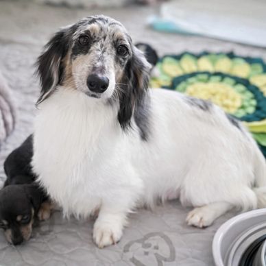 Haylo is a blue and cream long coat dapple piebald. She is my shadow.